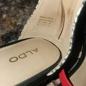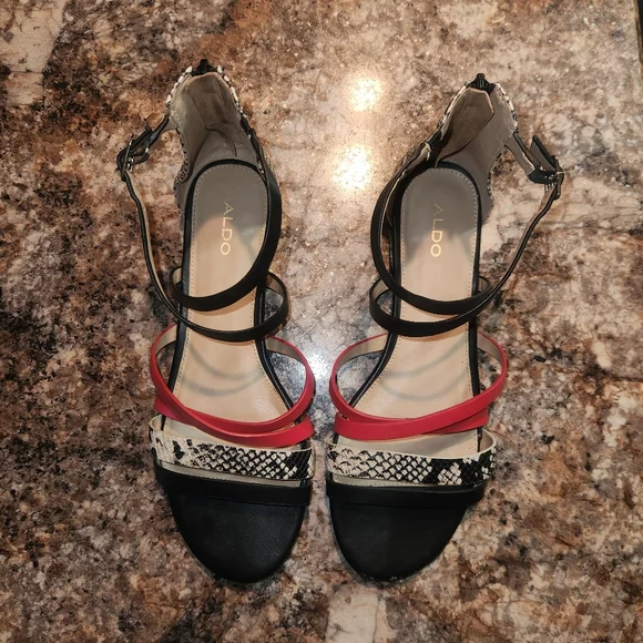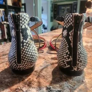 • Cute strappy black, red, and snakeskin gladiator style sandals with buckle ankle closure and zipper heel.
