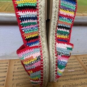 Brighten your look with these colorful crochet espadrilles. Features bold red detailing. Perfect for casual wear. True to Size. Like new.