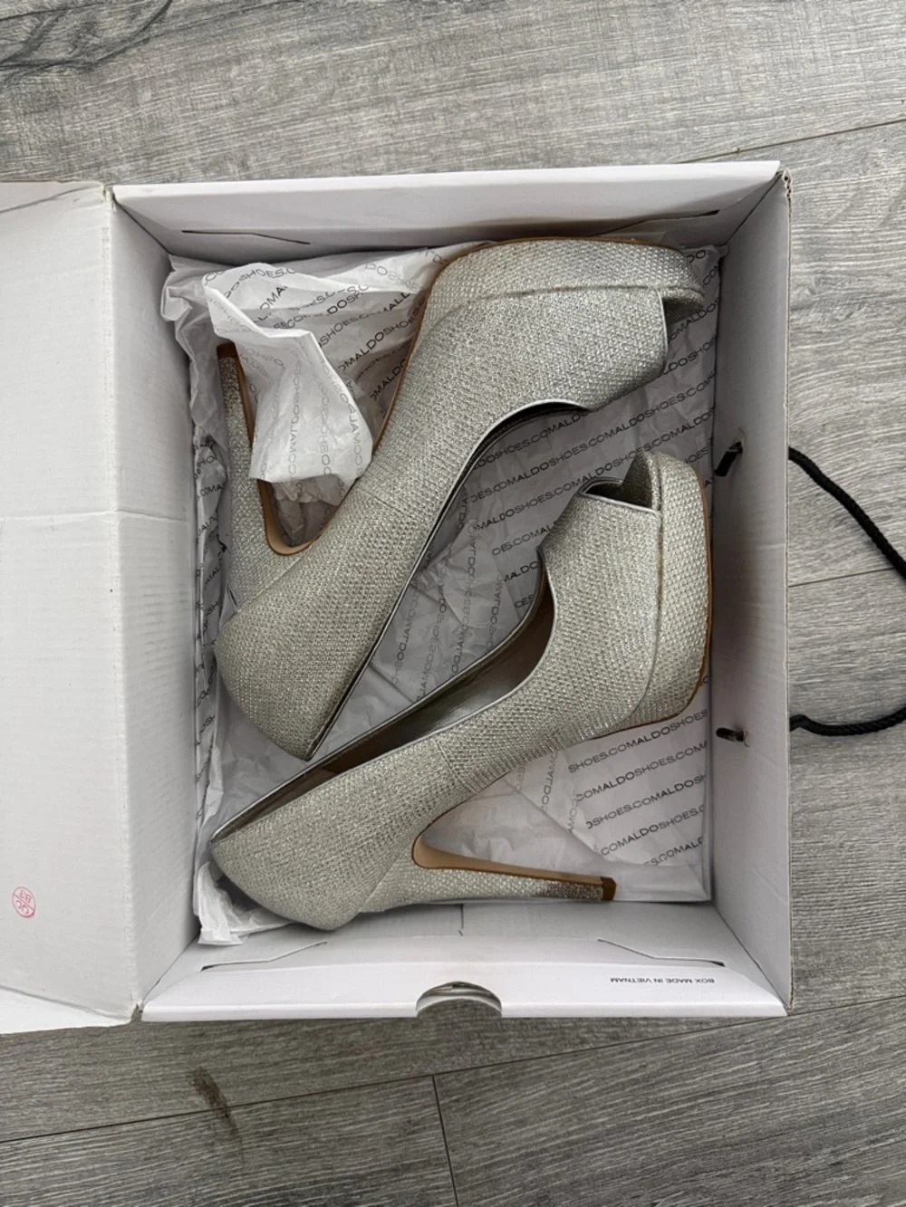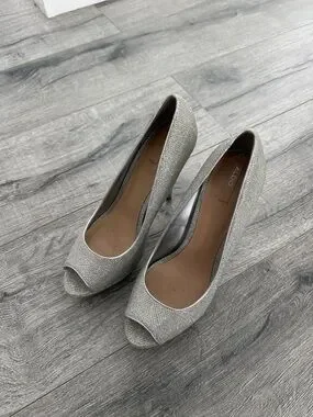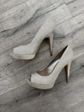 Stylish Aldo heels in sparkly silver. Only worn once. Sleek silhouette for dressy looks.