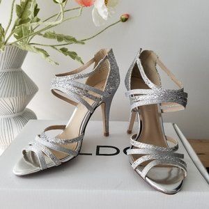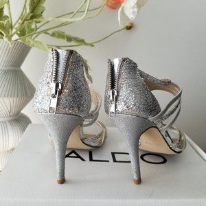 Glittery silver heeled sandals perfect for special occasions! Elegant stiletto heels; lightweight and steady.