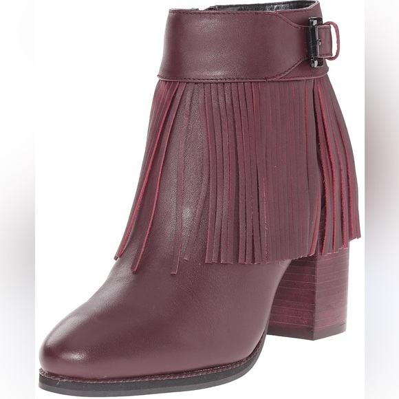 Stylish burgundy ankle boots with fringe detail. Perfect for a bold look.