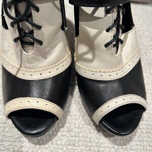 Oxfords Reimagined, Peep-Toe Bootie, these Aldo heels blend vintage Oxford detailing with modern allure. Black and ivory leather, featuring lace-up and buckle accents, cutout sides, and a rear zip for easy wear. Perfect for elevating both day and evening looks.