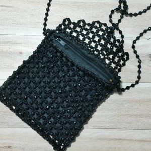 Vintage 90's Crossbody style evening purse covered in black sparkly beads, and beaded strap