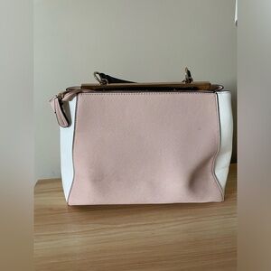 Chic tote satchel with blush pink and white panels. Gold bar. Beautiful colours. Features a sturdy black handle. Perfect for stylish outings.