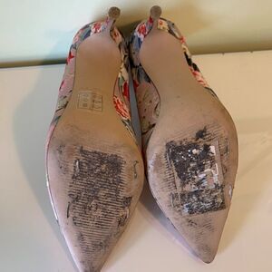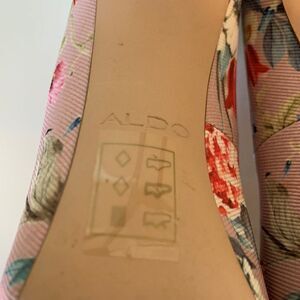 Classic pump from Aldo's Pillow Walk Collection. Padded heel and ball. Sz 6, in textured twill fabric. Ultra feminine multi coloured floral print on rosy beige background that is demure AND sexy. The inside is as pretty as the outside! In excellent, barely worn condition with no damage, wear or stains detected on uppers. 4 inch spike heel for all upscale events-date night, high tea, mother of the bride, from formal wear to daywear. We love these with rolled up boyfriend jeans and pretty crocheted crop top. Add a few accessories from Our Closet (some suggestion shown all listed and priced separately), make a bundle, save! There's always something fresh at Lemon Squeezy Shop🍋