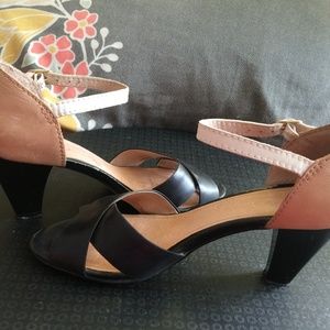 Cute summer sandals with shiny block heel for added comfort, adjustable white Ankle strap and wide criss cross straps. Signs of wear.