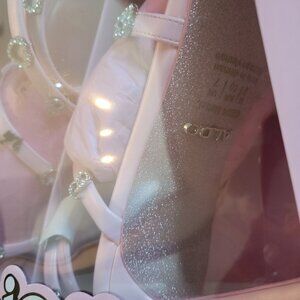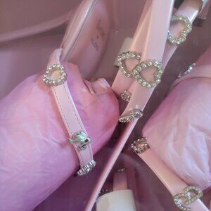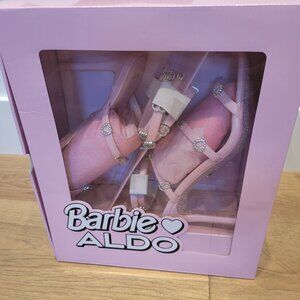 NEW in box - Aldo x Barbie pink runway sandal heels with coil ankle wrap. Features charm accents on the straps and an all glitter sole. Size 7.