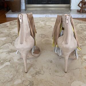 Boho meets bombshell in a fringe flowing sky high heeled bootie! These beauties are in as new condition and feature leather uppers, back zipper, almond toe, slight platform. Seriously, these shoes are super feminine and fun, total knockout style❣️
