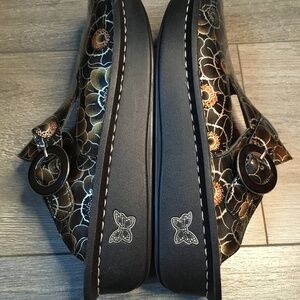 Stylish Alegria mules with floral design. Features black and gold colors. Comfortable and chic.