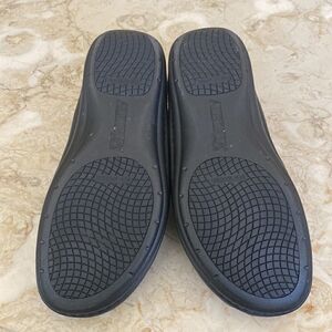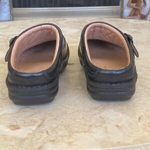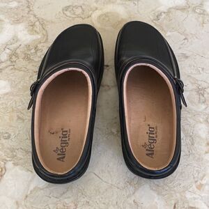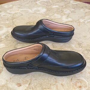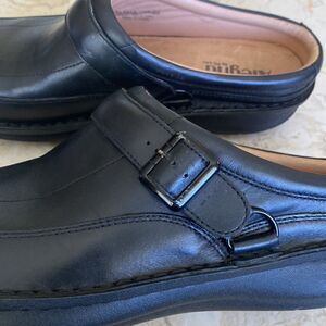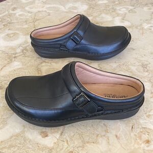 In excellent preowned condition the “Chairman” Black Nappa by Alegria is a classic open back mule style shoe with a sleek, simple silhouette, European styling.
