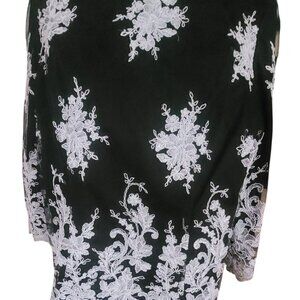Beautiful never worn black and white top adorn with white floral applique on a black silk background fully lined with invisible zipper and 3/4 length sleeves.