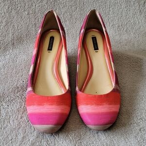 Round toe wedges, beautifully colored striped satiny fabric. In very good used condition, some wear on the soles.