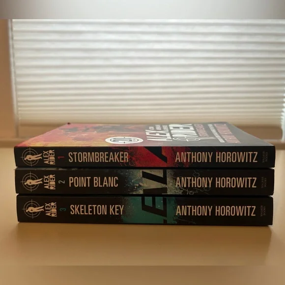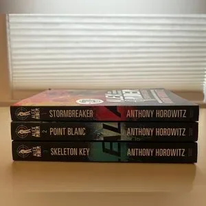 Set of first three Alex Rider paperback books by Anthony Horowitz. Includes 'Stormbreaker', 'Point Blanc', and 'Skeleton Key'.