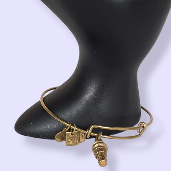 This bracelet is made of a gold/brass tone metal and attaches to itself with a loop on each end, allowing for some adjustability in size. The bracelet has 4 dangling pieces, including a dangling ice cream cone. 3 of the dangling pieces are thin with words and marks on either sides. One circle has an American flag heart and says "ALEX AND ANI US D498,167", the square has a triangular recycling symbol and says "CHARITY BY DESIGN", and the last circle says "INFUSED WITH (+) ENERGY TECHNOLOGY" and "ALEX AND ANI". There is normal wear, including tone darkening throughout giving it a slightly distressed appearance, (most visible on the smaller dangling pieces). I'm not fully sure of what kind of energy the bracelet is infused with, but there you have it.