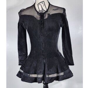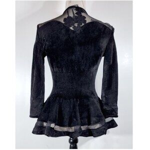 Fabric: The main body and sleeves are a rich, soft black velvet/velour (64% Viscosa, 36% Poliammide). The peplum's underlayer and the shoulder/neckline sections are a sheer mesh (73% Viscosa, 21% Poliammide, 6% Poliestere).