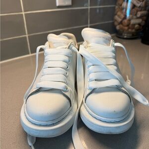 The Oversized Sneaker – statement silhouette in white calf leather, with a blue grey suede heel counter featuring the McQueen signature. Finished with a chunky rubber sole.