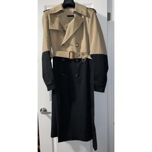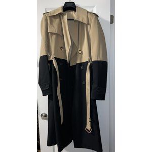 This beige cotton blend colourblock trench coat features a dramatic colourblock design, with the top half of the garment in a conventional beige tone and a contrasting bottom half in a dramatic black. Featuring button fastenings at the shoulder, a storm flap, an oversized collar, a double breasted front fastening, a belted waist, long sleeves, a long length and pleated details in the rear.