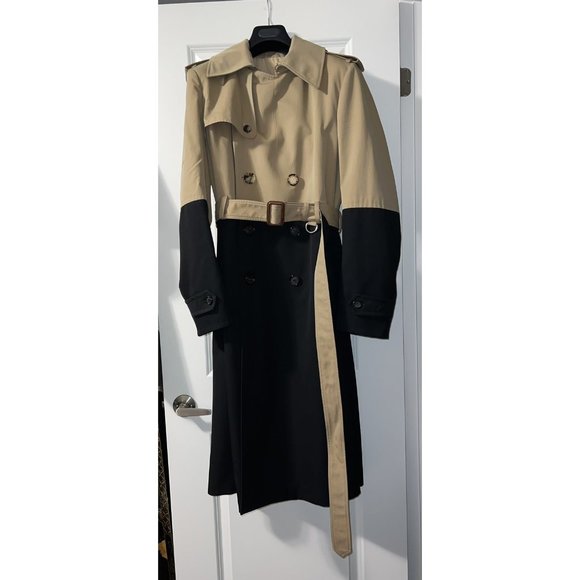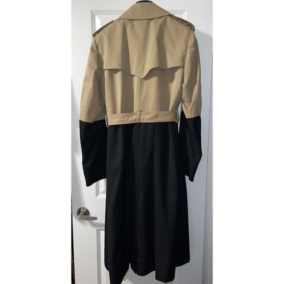 This beige cotton blend colourblock trench coat features a dramatic colourblock design, with the top half of the garment in a conventional beige tone and a contrasting bottom half in a dramatic black. Featuring button fastenings at the shoulder, a storm flap, an oversized collar, a double breasted front fastening, a belted waist, long sleeves, a long length and pleated details in the rear.