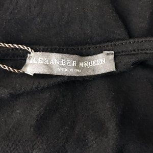 Alexander McQueen black T-shirt with green lips graphic. A strange design (so McQueen) that has an extra pouch of fabric at back shoulders and front scoop neckline. Made in Italy with no size or content labels but feels like a thin 100% cotton jersey.