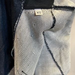 This dress is very unique and quite stunning. It is a lightweight knit with a pattern of tearing revealing the lighter shade underneath. The colour is blue/back and has a built-in scarf. It is a size XS and is very fitted.