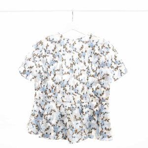 THE perfect summer top!!! This Alexander McQueen peplum blouse is sheer with floral jacquard pattern throughout. This top slips over your head and fastens at the neck with 2 buttons. The material tag has been cut out of the garment but it's in very good condition. A size 44 IT is equivalent to an 8 US and would fit someone who is a medium.