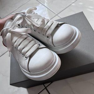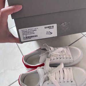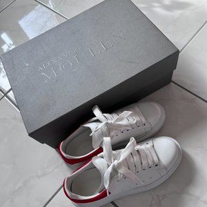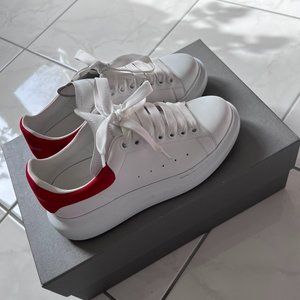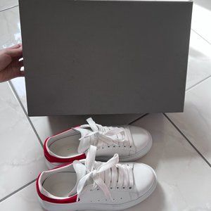 Stylish white sneakers with bold red accents. Features classic lace-up design. Perfect for casual wear.
