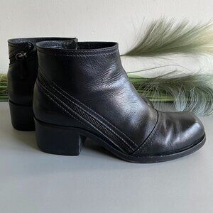 Sz 10 Authentic Alexander McQueen Women's Black Leather Ankle Boots. Fits true to sz, I wear 10 med and these fit perfectly with tad wiggle room. Features: Made In Italy, tapered rounded toe, unique angled wrap around side zipper, 2" wood block heel, leather lining, leather upper, minimalist stitching, Embossed outsole with MCQ & Outsole Alexander McQueen, 40. Some light creasing around toes, block heels show wear as pictured.
