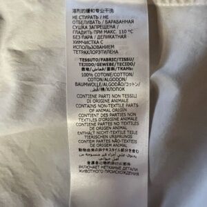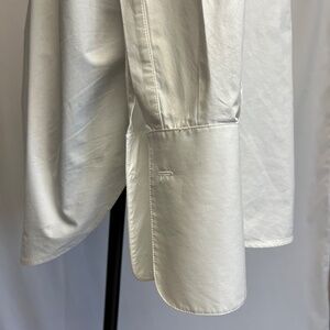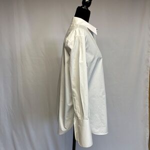 This is an oversized cotton shirt with long cuffs. There is an abstract rose on the left side. It was only worn once.
