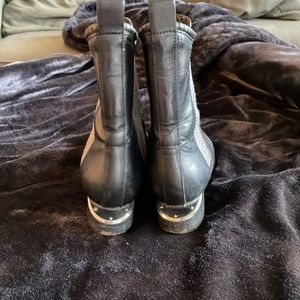 Black leather Alexander Wang Anouck Boots with grey elastic detailing. Shoe runs a little narrow but otherwise is true to size. I’m usually around a 6 and sized up.