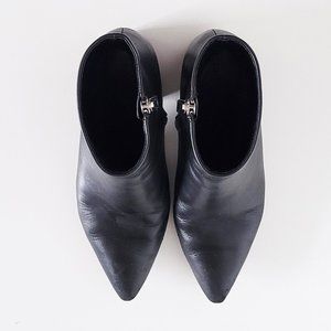 Sleek black leather ankle boots. Features side zipper and block heel. Modern and stylish design.