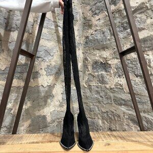 Alexander Wang Black Lyra Over the Knee Lace Studded Boots. Black stretch lace upper. Pointy-toe. Silver-tone stud details at midsole. Stiletto heels. Black leather insoles. Made in Italy. Come with the box and a dustbag.