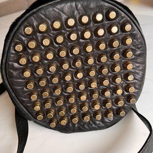 This super chic bucket bag is crafted of black pony hair and features a short strap handle, a leather shoulder strap that turns into a leather cinch cord, and brass hardware including a base completely lined in studs of the same. The top opens to a black fabric interior with a zippered pocket. This is an excellent shoulder bag, ideal for everyday use, from Alexander Wang!