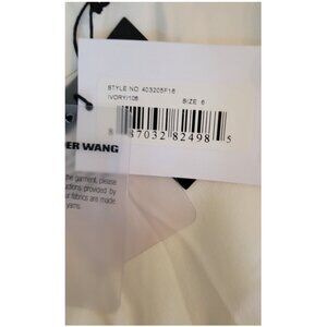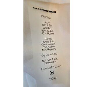 This is an Alexander Wang women's top in a size 6, style number 403205F16. The color is ivory, and the style features a unique layered look with a slightly sheer bottom layer. The top is made from a luxurious mix of fabrics: the body is 100% silk, while the combo layer is a blend of 55% cupro and 45% rayon. The material composition gives the top a beautiful, subtle sheen. Care instructions state dry clean only. It's a versatile piece that could be dressed up for an evening out or paired with trousers for a professional look.