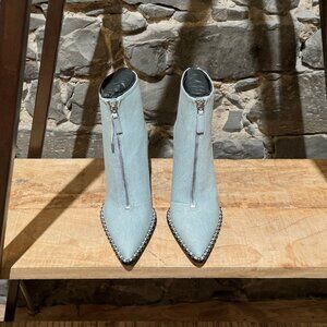 Alexander Wang Light Blue Denim Eri Studded Ankle Booties. Zippers at front and at back. Studded all around. Silver tone hardware. Pointy toe. Covered heels. Leather sole and insole. Made in China. Comes with original box and dust bag.