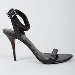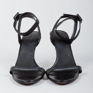 Alexander Wang black soft leather ankle-strap sandals with leather-covered buckle closure and pillow details on straps.