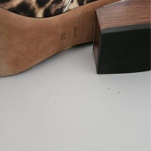 New Alexander Wang ponyhair leopard patterned booties with wrapped stacked sculpted heels, pointed toes and side zipped closure. Heel: 2"; Shaft: 5.5" New with minor residue on soles due to tags. Size EU38