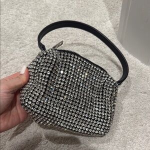 This Alexander Wang clutch dazzles with its silver rhinestone embellishments, offering a glamorous touch to any evening ensemble. Its compact, rounded design is perfect for carrying essentials while making a bold fashion statement. The wristlet strap adds convenience and style, making it an ideal accessory for festive occasions.