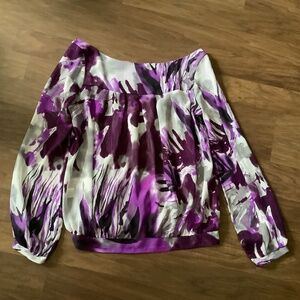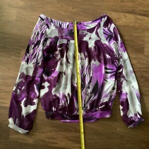 Purple and grey semi sheer chiffon, abstract forest print. Voluminous puff sleeves with button closure cuffs. Excellent condition, no flaw noted.