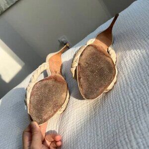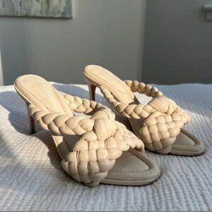 A soaring heel and Napa leather braided construction set these gorgeous shoes apart from the crowd. Extremely comfortable and wearable. Super supple leather. Worn once. Very comfy
