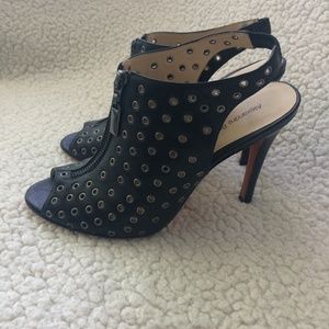 Black leather, metal eyelets, peep-toe, slingback, 100mm (4”) heel, size 38/8. Some indentations on heels.