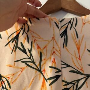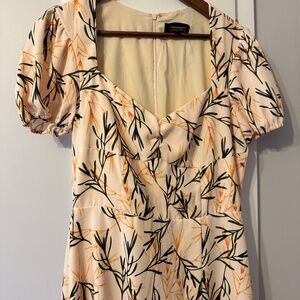 Originally purchased at Nordstrom Rack in the US. I never wore it. The dress is a size 10 but fits more like a size 8. It’s back zip with no elastic waist and the sweetheart neckline is very flattering. The color is a peachy color with orange and green patterns.