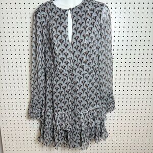 Chic Alexis Alba mini dress in the Art Deco Sage pattern. Adorable ruffled bottom and sleeves with opening at chest.