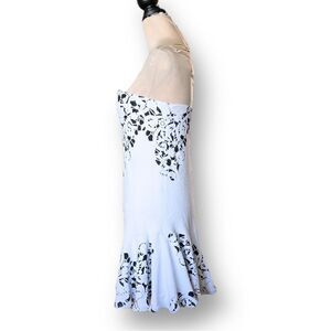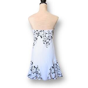 This fun and versatile strapless mini dress from the brand Alexis skims the body of the wearer and features a flirty ruffle flutter skirt. Comprised of primarily white stretchy textured nylon blend material with a black and white floral pattern. The bodice features a hidden bustier corset with hook and eye closure that provides excellent support and keeps the dress from slipping down. Has a hidden side zip closure.