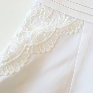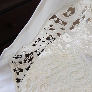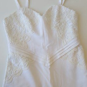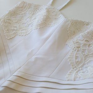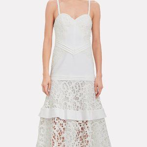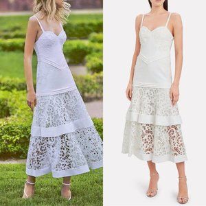 White cotton and polyester Harlowe lace maxi dress from Alexis featuring a tiered design, a sweetheart neckline, shoulder straps, sheer lace panels, a mid-length and a flared style.