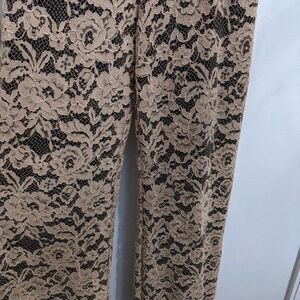 All over lace jumpsuits speak to the must-have silhouette of the season. An off the shoulder cut with velvet halter neck self tie straps. Short sleeves. Self tie velvet sash wraps at waistline. Zip closure at back. Lined. In nude. Fabric: 72.2% nylon/27.8% polyester. Lining: 96% polyester/4% spandex. 24" leg opening.. Color: natural