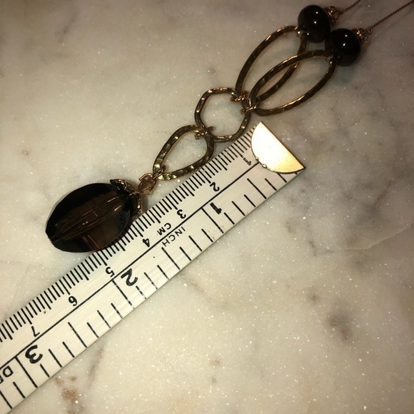 Alexis K - gold tone necklace with Smokey topaz coloured Crystal Gold Tone Necklace - circle hoop accents - necklace measures approx 16” with a 2” Pendant Drop - 2.5”’of extra chain tag so necklace can be adjusted to be a little longer!