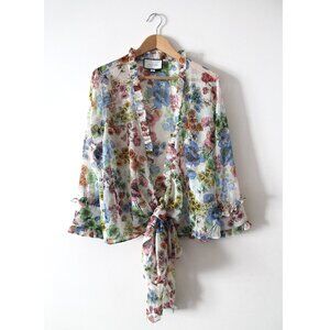 100% poly. Dry clean only. Wrap front with tie closure. Ruffle trim. Semi-sheer fabric. Buttoned cuff sleeves.