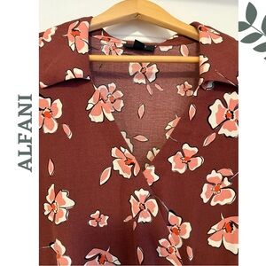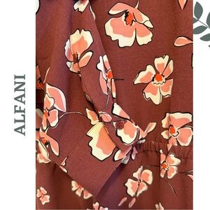 Turn heads and brighten your wardrobe with this beautiful Alfani blouse, designed in a rich brick red base splashed with peach, coral, and cream florals. This lightweight, flowy piece is perfect for fall layering or adding a pop of cheerful print any time of year!