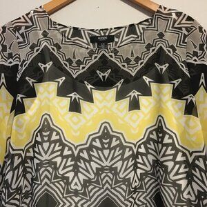 Very good preowned condition, semi sheer modern, geometric printed chiffon bell sleeve top in trippy black, white and yellow pattern with built in white tank, stretchy tank top. Disco fun.