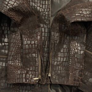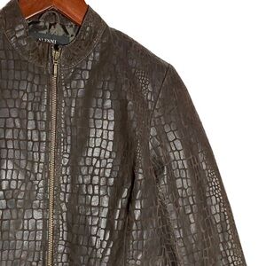 Alfani Petite Brown Leather Jacket Crew Neck Snake Skin Pockets Peplum PP